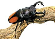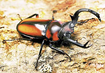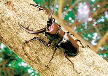 甲虫目クワガタムシ科の昆虫は、約1100種類が知られています。カブトムシの武器は角ですが、クワガタムシの武器は大あごです。大きな頭の中には、このあごを強い力で動かせるよう、筋肉もたくさんつまっています。カブトムシが頭と胸を連携させて力を出すのにくらべ、クワガタムシは口先の力だけで相手を挟み込むことができるのです。この方法はとても便利なのか、カブトムシのように胸に角をはやし、その角の力を借りるクワガタムシは今のところ発見されていません。口でかみつく方法はとても便利なようですが、大切な食べるための道具の一部を武器にしてしまったクワガタムシは、ほかの昆虫にくらべ、食べ方にも特別な工夫をしているのかもしれません。