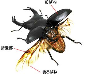 クワガタムシの後ろばねは、中央に折畳部があり、ふだんは、この折畳部で折りたたんで、前ばねにかくされています。飛ぶときには、前ばねを開いて、後ろばねをひろげます。