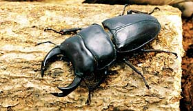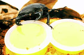 えさ  えさの昆虫ゼリーは、なくなったり、マットがこびり付いて汚れがひどいときには、新しいものに交換します。大きなあごをもつクワガタムシには、ゼリーを半分に切ったものを与えると、食べやすくなります。ゼリーのほかに、バナナやリンゴを与えるといいでしょう。