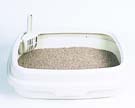 トイレ砂は、安価な砂タイプ、軽くホコリが出ない木や紙などのパルプタイプがあります。紙おむつのようなシートタイプもありますが、砂がないと排泄したがらないネコもいるので、その場合はシートを砂の下に敷くと掃除が楽です。 |