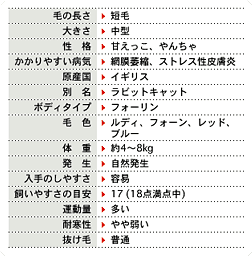 その猫種の飼いやすさを、数値 (18点満点) で表しました。数値が高いほど、飼いやすい猫種だという目安になります。