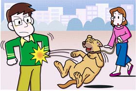 止めさせる方法で、もっとも効果的なのは、飛びつかれた人が、思い切り犬に体当たりしてふっとばすことです。そうされた犬は、飛びつくことではね返されるという、嫌な思いをすると知り、やらなくなります。