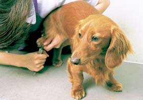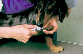 爪を切るときには、犬のひじの関節を小指にひっかけ、他の指で足の裏になる部分を持ちます。足先だけ持つと、あばれます。親指と人差し指で押して爪を出し、尖った部分を切ります。歩いていれば丸くなるので、爪の切り口は気にしないでけっこうです。 |