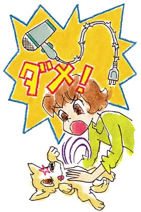 首筋をちょっと力を入れてつかみ、やっているところから少し遠ざけるように、手で移動させたり、口吻部分を軽くつかんだりしてもいいです。