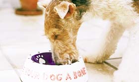 - 言葉だけではキョトンとして座らないときには、「スワレ!」と繰り返し言いながら、食器を持っていない方の手で犬の腰を押して、座った姿勢を作ります。ストンと座ったら、褒めて食事をあげます。