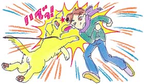 陽気な顔で飛びかかろうとするときには、遊ぼう!と誘っている可能性があります。相手が顔見知りの犬なら近づけても大丈夫でしょうが、知らない犬なら、「イケナイ!」「遊べないよ!」と強い口調で声をかけ、リードを下方に引いて、止めさせます。リードを上に引くと、犬の首がつられ、苦しさから余計に前に出るので、注意してください。 |