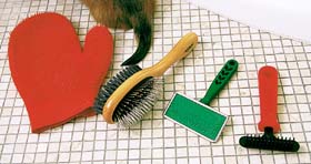 次にラバーブラシ。これは毛の先が球状になっていて、皮ふへのあたりが軽いブラシです。下に綿毛を持つ犬の換毛期には、スリッカーブラシが便利です。シャンプーのときには、錆びないプラスチックや塩ビ系のブラシも使いやすいです。そして獣毛ブラシ。静電気をほとんど起こさないので、手入れの仕上げに使うことが多いです。