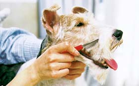 毛の多い犬、長い犬は、最初は一部分ずつ手にとってとき、最終的に全体をブラッシングします。コームは目の粗いもので丹念に毛をとき、その後、目の細かいものに替えて、とくと、きれいな毛並みにできます。 |