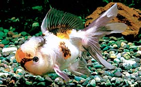 水中で揺らぐ尾が美しい、更紗リュウキン |
