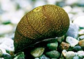 河口の汽水域にも生息している貝で、ガラス面や石などに付着したコケを食べてくれる、水槽内の掃除屋です。ガラス面に少し黄色っぽい小さな卵を産み付けますが、塩分濃度がないとふ化しません。 |