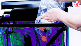 - 次に、袋を開けて、クリップなどで水槽のふちに袋を留めるなどしてから、水質を合わせるため、水槽の中の水を袋の中に少しずつ入れていきます。このとき金魚の飛び出しに注意します。