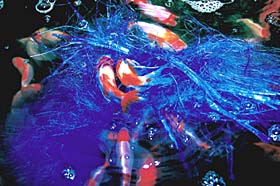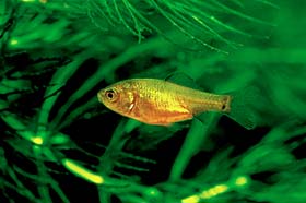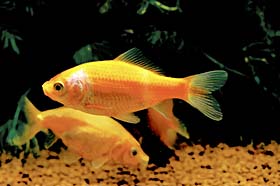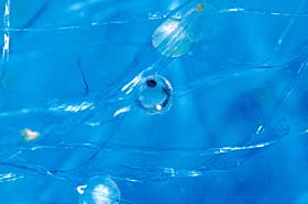 複数飼育していて、飼育環境に適応していると、金魚は産卵します。金魚の卵は、直径2〜3ミリの半透明の卵で、水草などに産み付けられています。産卵の兆候は、オスがメスを追いかけ回します。産卵は、水草などにメスが体をふるわせるようにこすりつけて、そこにオスが群がっています。 |
