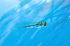 梅雨の終わり頃、金魚はいっせいにオスがメスを追いかけるようになり、メスはそれに刺激され水草などに産卵を始めます。このときオスはメスに群がり放精し、卵が受精します。受精後3〜4日後には稚魚が誕生します。