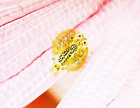 魚の体やひれなどに肉眼でもはっきりわかる白い水カビが発生するものです。感染部には菌糸状のものが見られます。その患部は炎症も起こし、出血がある場合もあります。初期症状では、わずかな部分に見られますが、症状が進むにつれて、徐々に患部が広がっていきます。