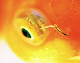 鼻部に寄生したイカリムシ。がっちりとくい込んでいます