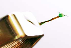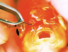 毛抜きなどで、イカリムシが切れないように、ゆっくりと抜き取ります。成功するには、かなり高等な技術が必要です