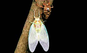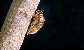 アブラゼミは、卵からふ化して、6年間を土の中ですごします。土の中では木の汁などをすって成長し、7年後、地上に出てきて、木に登り、成虫へと羽化します。毎年、夏になると、夜間、地上を歩く幼虫を見つけることができます。羽化を観察するには、この幼虫をそっと持ち帰り、木に止まらせます。しばらくは、自分が気に入る場所を探して、木を登ったり降りたりしてますが、そのうちじっと動かなくなります。すると羽化の始まりです。幼虫の背中が割れ、白い成虫が現れます。