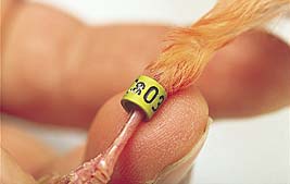 カナリアの足管には、それぞれのカナリアが生まれた年度などが刻印されています。この番号はカナリアの品評会に出すときの登録番号になります。