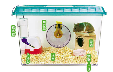 ケージのほかにも、プラスチックケースや水そうで飼えます。ハムスターの種類によって、プラスチックケースの大きさを選びましょう。セットする用具は、ケージとほとんど同じです。