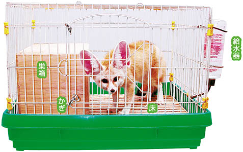 フェネックは、小型犬やネコと同じように飼育することができます。飼育スタイルの基本は、大きめのケージの中に、安心できる巣箱やクッションなどの場所をつくることです。また、首輪をつけて、散歩に出かけることもできます。