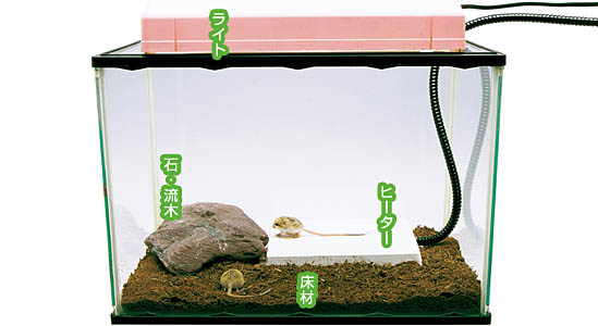 小動物用のヒーターをセットして、つねに暖かい場所を作っておきましょう。