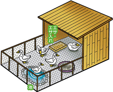 雨をふせぐためや、直射日光をふせぐための屋根や、飼う数によっては、広い運動場が必要です。運動場の周りや天井部分は、フェンスで囲いましょう。