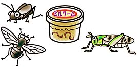飼育容器によっては、生きたコオロギやバッタなどを放して、自分で捕食するようにできます。ケージでは、虫が逃げてしまうので、先を丸めた割りばしなどで、1匹ずつ与えるようにしましょう。