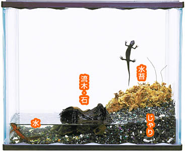 金魚などの細かめのじゃりを使いましょう。初めて使う場合は、水ににごりがなくなるまで、よく洗いましょう。飼育容器の半分から3分の1程度が陸地になるようにしましょう。なだらかな坂にしておくと、イモリが上陸しやすくなります。