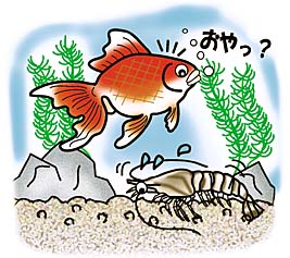 カルキ抜き剤や、1日汲み置きした水を使用しましょう。また、金魚など、大きめの魚といっしょに飼育すると、魚のエサの残りをそうじして、水の汚れ防止にもなります。