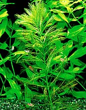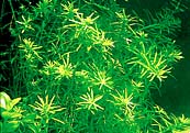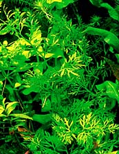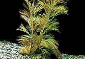 国産のいわゆる金魚藻ですが、最近は、カボンバやアナカリスなどの外国産の "金魚藻" に押されて、熱帯魚店のほうがおなじみです。非常によく増えますが、新しい貝殻混ざりの砂には弱く、溶けることがあります。 |