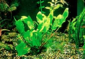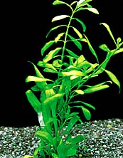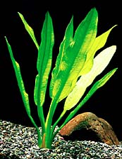古くから親しまれているポピュラーな水草です。丈夫で、一本で60cm水槽の半分を覆うほどになります。葉にウェーブがかかったブロードリーフと、まっすぐなナローリーフが区別されていないときがあり、両者は別種です。 |
