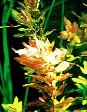 金魚藻でポピュラーなカボンバ・アクアティカの仲間で、成長している芽の部分が、赤くなるきれいな種類です。光量、二酸化炭素とも多くしないと、成長はするものの、赤い色は色褪せ、下の葉が枯れて水質を悪化させます。 |