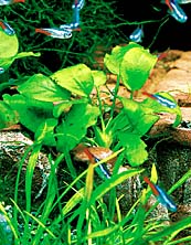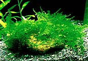 シダの仲間で、日本にもミズワラビの名で自生しています。強健種で、千切れた葉を浮かべておくだけで、葉の縁から次々に子株が出て増殖するため、グッピーなどの繁殖水槽にも使われます。 |