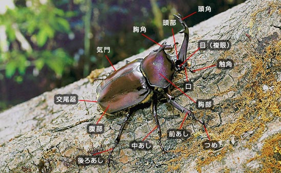 カブトムシの体は、硬い皮ふと大きな角が特徴です。しかし、ほかにもカブトムシの体にはひみつがたくさんかくされています。各部の名前と、主な特徴を説明します。