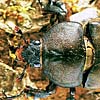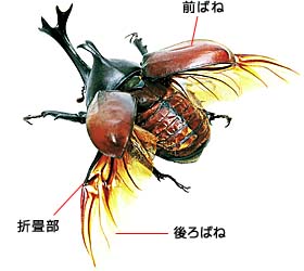 カブトムシの後ろばねは、中央に折畳部があり、ふだんは、この折畳部で折りたたんで、前ばねにかくされています。飛ぶときには、前ばねを開いて、後ろばねをひろげます。