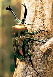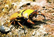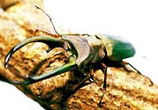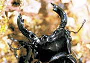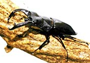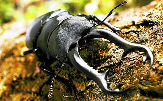 甲虫目クワガタムシ科の昆虫は、約1100種類が知られています。カブトムシの武器は角ですが、クワガタムシの武器は大あごです。大きな頭の中には、このあごを強い力で動かせるよう、筋肉もたくさんつまっています。カブトムシが頭と胸を連携させて力を出すのにくらべ、クワガタムシは口先の力だけで相手を挟み込むことができるのです。この方法はとても便利なのか、カブトムシのように胸に角をはやし、その角の力を借りるクワガタムシは今のところ発見されていません。口でかみつく方法はとても便利なようですが、大切な食べるための道具の一部を武器にしてしまったクワガタムシは、ほかの昆虫にくらべ、食べ方にも特別な工夫をしているのかもしれません。
