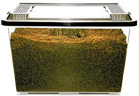 オオクワガタやヒラタクワガタ、コクワガタなど、寿命が数年になる種類は、自然界では気温が下がってくる秋になると、木のうろ(木に開いた穴のこと)やさけ目などでじっと動かなくなり冬眠します。飼育していても、秋になるとえさを食べなくなり、マットにもぐってばかりで、姿を見ることが少なくなります。これは冬眠の準備に入っている証拠です。秋になったら、マットをプラケースに半分以上の量をしいて、気温が低く、なるべく温度変化の少ない場所におきましょう。 |