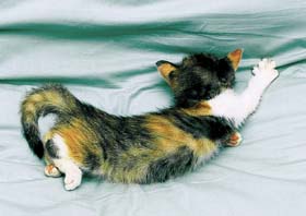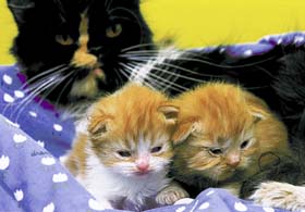 ネコミルクはペットショップで市販されているものを必ず使います。牛乳はネコのミルクと成分が違うため、子猫は下痢をしてしまい、うまく育ちません。ミルクを飲ませた後は、湿らせたティッシュで肛門のあたりを刺激してやると、排泄するので必ず、そこまでしてください。 |