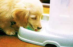 子犬は、遊んでは寝て、食べてはまた遊びます。その間に、水を飲みたがるので、飲み水はいつでも飲めるように、新鮮なものを用意しておきましょう。あまりせまい場所や、遊び場の中に置いておくと、食器に足を突っ込んで、びしょぬれになってしまいます。少し離れた場所や、サークルやケージの扉を開けて、その中に置いておくといいでしょう。サークルやケージなどの寝る場所にも、いつでも水が飲めるように用意しておきましょう。