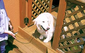 ショックを与えるのはかわいそうと、門をぶつける力に手加減があれば、それは犬に見抜かれます。たいしたショックではないと、次も同じ繰り返しになります。絶対にダメ!という強い意志でショックを与え、次からはそうしないでいいように、もっていきましょう。 |