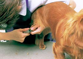 爪を切るときには、犬のひじの関節を小指にひっかけ、他の指で足の裏になる部分を持ちます。足先だけ持つと、あばれます。親指と人差し指で押して爪を出し、尖った部分を切ります。歩いていれば丸くなるので、爪の切り口は気にしないでけっこうです。 |