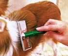 スリッカーブラシ 金属製で針金状のピンを植えたブラシ。抜け毛を除去したり、簡単な毛玉をほぐしたりして、毛並みを整えるためのブラシで、柔らかい毛の犬に使用する。体に押し付けると、犬の皮膚を傷めるので、浮かしぎみに使う。