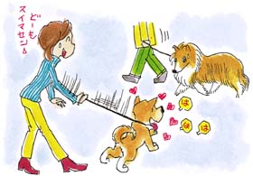 陽気な顔で飛びかかろうとするときには、遊ぼう!と誘っている可能性があります。相手が顔見知りの犬なら近づけても大丈夫でしょうが、知らない犬なら、「イケナイ!」「遊べないよ!」と強い口調で声をかけ、リードを下方に引いて、止めさせます。リードを上に引くと、犬の首がつられ、苦しさから余計に前に出るので、注意してください。 |