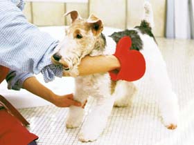 毛の多い犬、長い犬は、最初は一部分ずつ手にとってとき、最終的に全体をブラッシングします。コームは目の粗いもので丹念に毛をとき、その後、目の細かいものに替えて、とくと、きれいな毛並みにできます。 |
