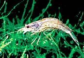 エビ目スジエビ科で、魚の飼育においては、生き餌としてやコケを食べたり、えさの食べ残しの掃除屋と、あらゆる方面で活躍しているエビです。おすの方が小さく、めすの方が大きくなります。 |