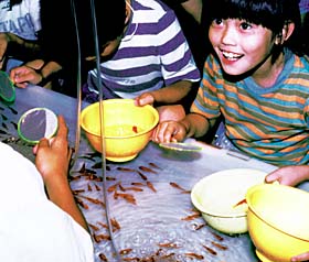 - 最後に、袋の中の金魚を水槽に入れます。この時、金魚だけを水槽の中に入れ、袋の中の水は、水槽の中に入れない方が良いです。