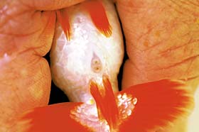 金魚のオスとメスの見分け方は、上級者でなければ難しいと思います。ふつうはオスの生殖孔はメスよりも小さく、楕円形をしています。メスは生殖孔がほとんど円形で、オスよりも大きく、横から見ると出っぱっています。