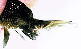 魚の体やひれなどに肉眼でもはっきりわかる白い水カビが発生するものです。感染部には菌糸状のものが見られます。その患部は炎症も起こし、出血がある場合もあります。初期症状では、わずかな部分に見られますが、症状が進むにつれて、徐々に患部が広がっていきます。