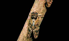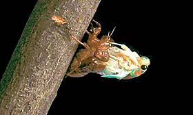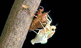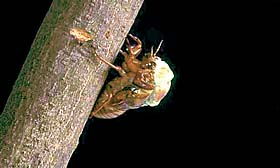 アブラゼミは、卵からふ化して、6年間を土の中ですごします。土の中では木の汁などをすって成長し、7年後、地上に出てきて、木に登り、成虫へと羽化します。毎年、夏になると、夜間、地上を歩く幼虫を見つけることができます。羽化を観察するには、この幼虫をそっと持ち帰り、木に止まらせます。しばらくは、自分が気に入る場所を探して、木を登ったり降りたりしてますが、そのうちじっと動かなくなります。すると羽化の始まりです。幼虫の背中が割れ、白い成虫が現れます。