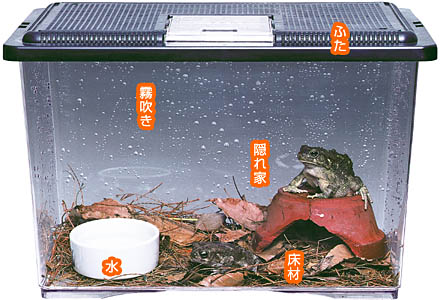 陸生のカエルは、水で濡れている必要はありませんが、体が湿っている必要があります。毎日霧吹きで、カエルの体や飼育容器のガラス面を湿らせておくようにしましょう。